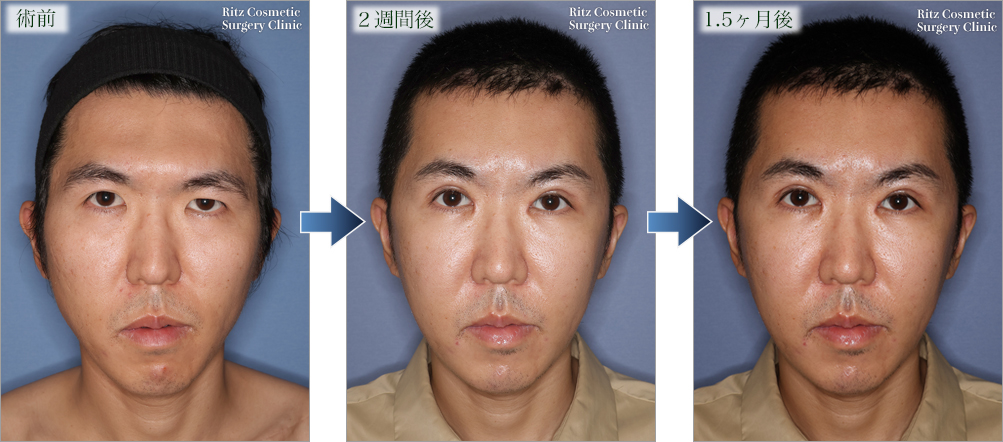 頬骨の側方への張り出しを改善するために頬骨内方転位を行っていますが、内側移動量は右側6mm、左側5mmです。手術前には凸凹とした顔面輪郭でしたが、術後にはこめかみから頬にかけて凹凸のない滑らかなアウトラインとなりました。
