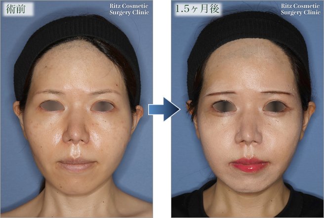 頬骨の側方への張り出しを改善するために頬骨内方転位を行っていますが、内側移動量は右側6mm、左側5mmです。手術前には凸凹とした顔面輪郭でしたが、術後にはこめかみから頬にかけて凹凸のない滑らかなアウトラインとなりました。